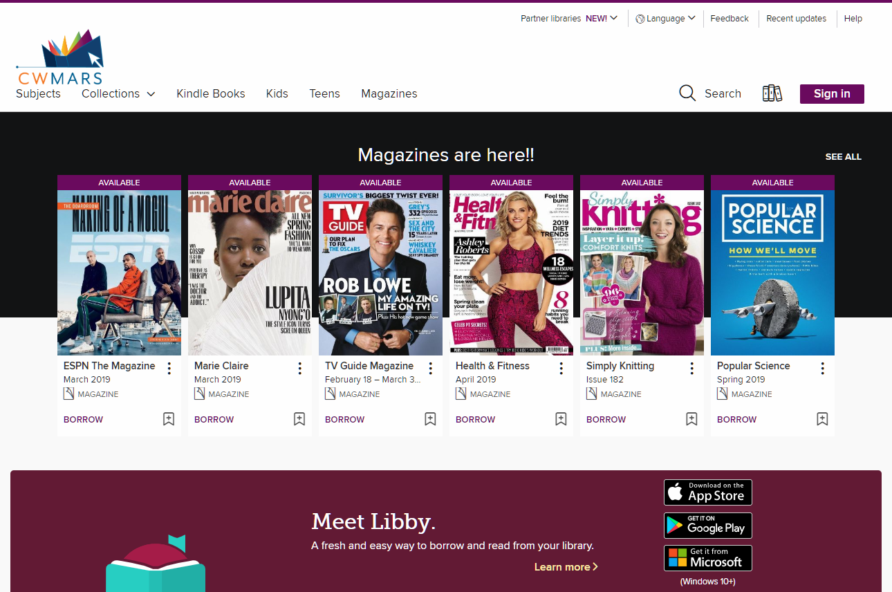 Borrow from the library 24/7! Ebooks, audiobooks, comic books, and magazines. The CWMARS digital collection, Overdrive and the companion app Libby — is always available.